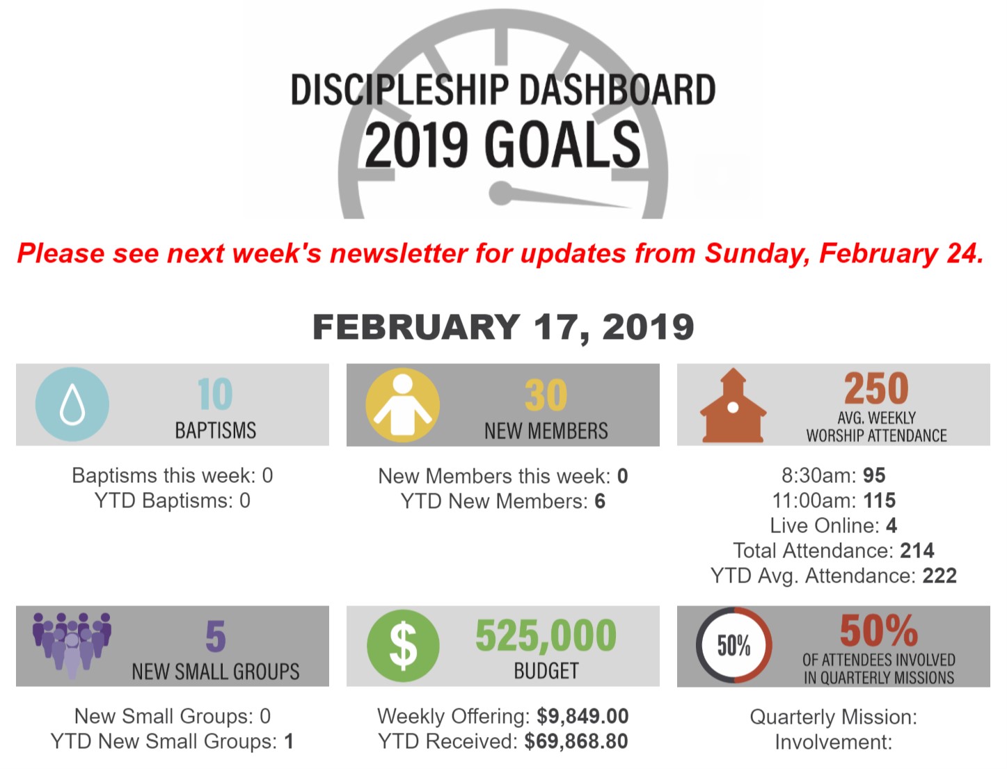 For each of these areas, a specific goal was set; 10 baptisms, 30 new members, 250 average weekly attendance, five new small groups, a budget of $525,000, and at least 50 percent of attendees involved in quarterly missions.