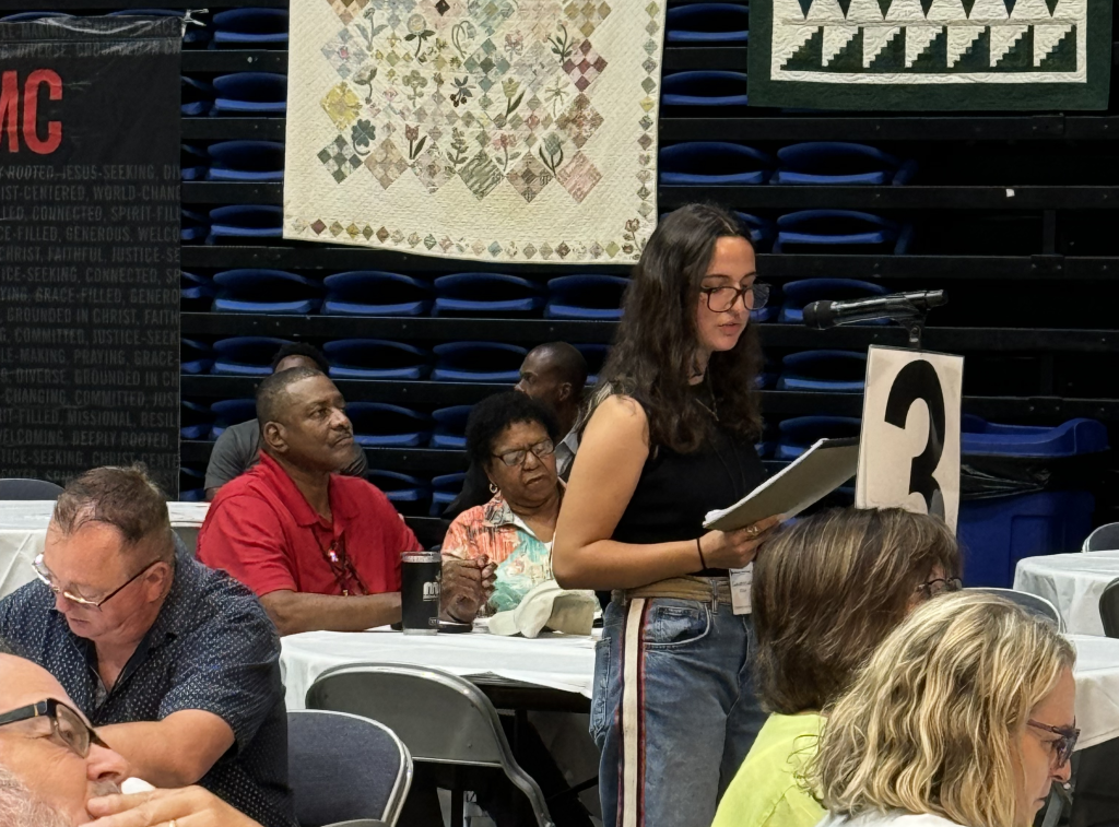 Rev. Betsy Singleton-Snyder reminds those attending about a resolution to ask every church to create a green team. She requests those attending to take a survey, which will be available tomorrow via QR code on the screens in the conference.