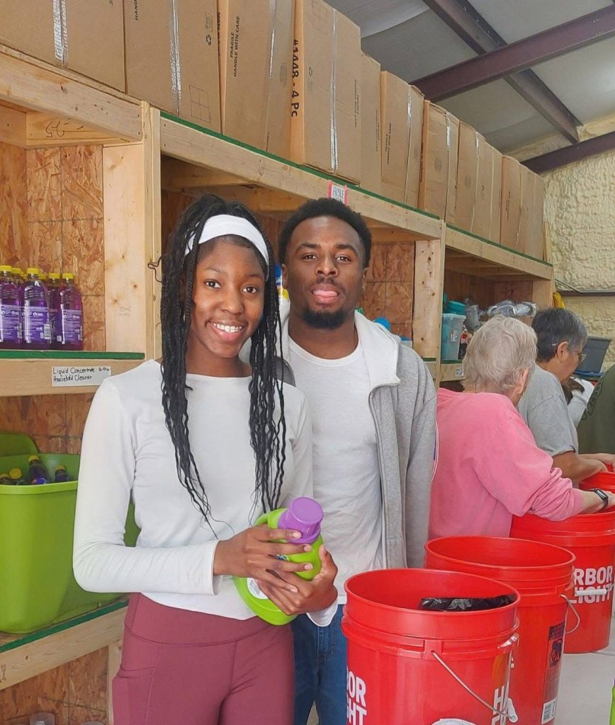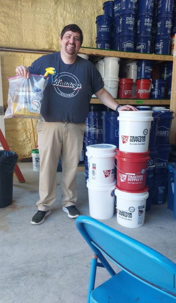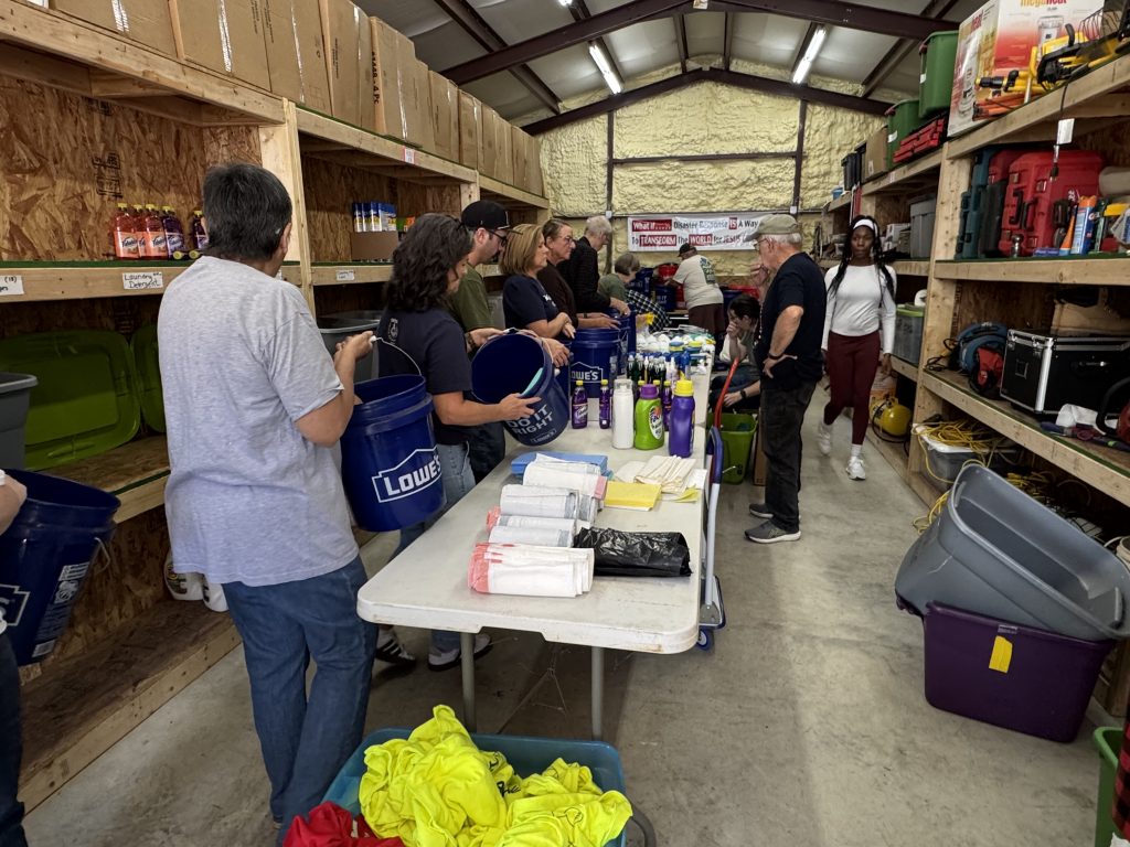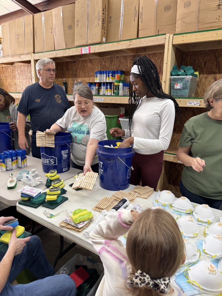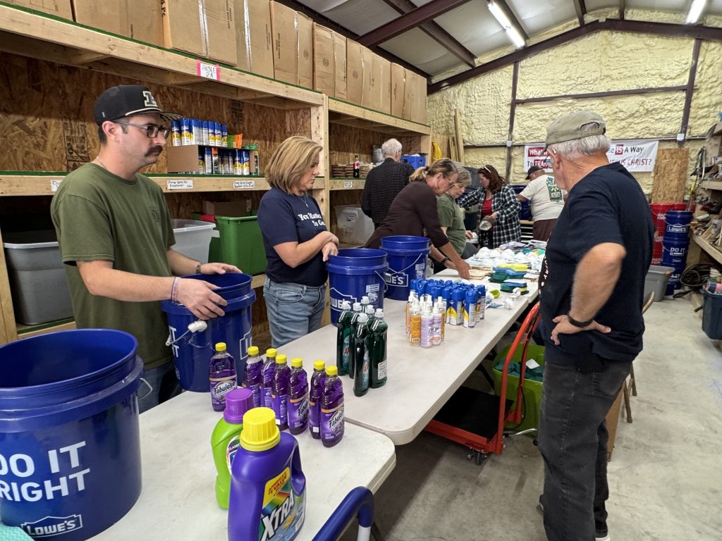 It took 40 volunteers a record time of 1 hour and 15 minutes to put together 109 kits, making the total 308 cleaning kits on VIM/DR shelves, which Shelley says is enough for the spring tornado season.
