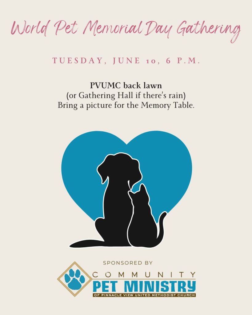 The Pinnacle View UMC Pet Ministry will hold its annual World Pet Memorial Day Remembrance Gathering on June 10 at 6:00 p.m. in the back garden space of the Pinnacle View UMC campus. This day was established by the American Veterinary Medical Association to remember the pets who are no longer with us. “The local […]